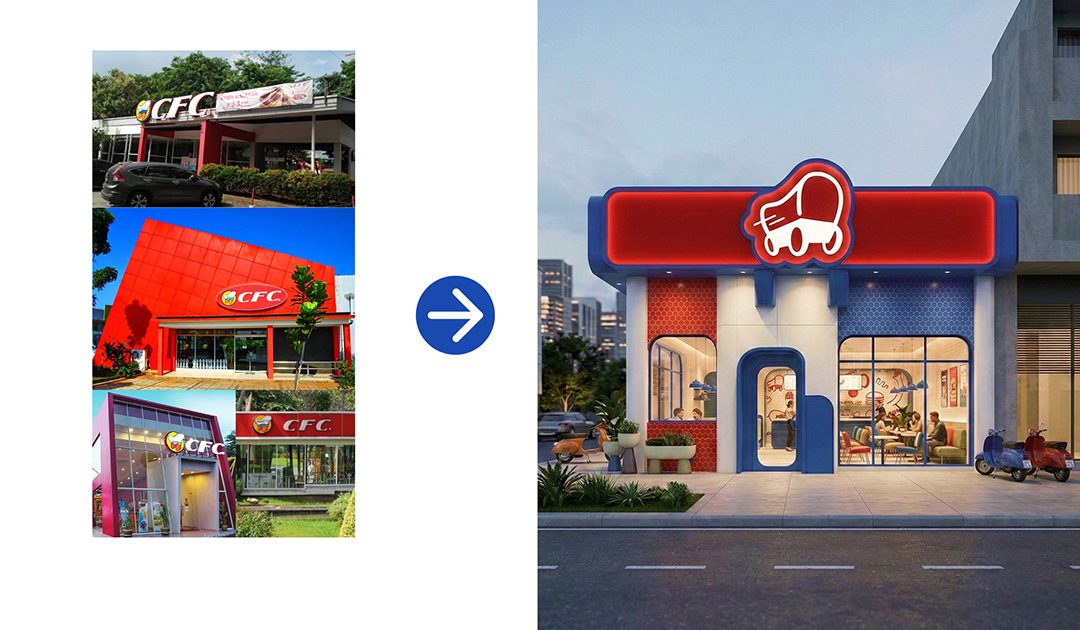 To further visualize the brand’s potential, I also explored a conceptual outlet redesign using AI-assisted rendering. The design translates the visual identity into a physical space, incorporating the red-blue color system, rounded architectural forms, and the wagon logogram as a prominent storefront sign to create a modern yet recognizable brand experience.
