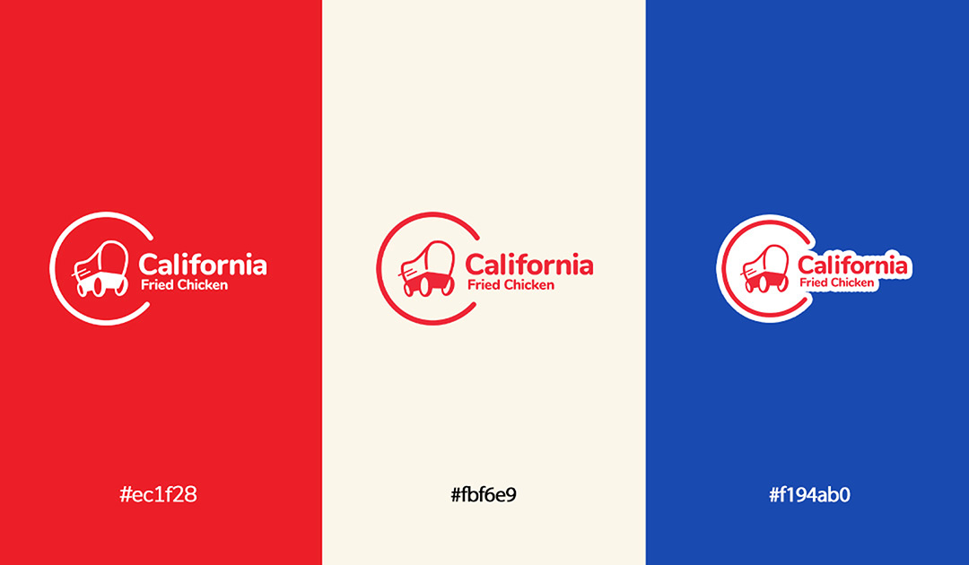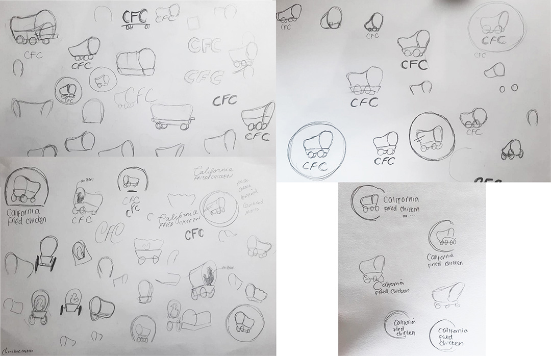 I digitized the sketches and explored variations in color, composition, and typography. While I initially tested yellow and additional graphic elements, these options added unnecessary complexity and raised scalability concerns. I ultimately focused on the wagon and the full brand name, “California Fried Chicken,” to clearly differentiate the brand from competitor KFC.