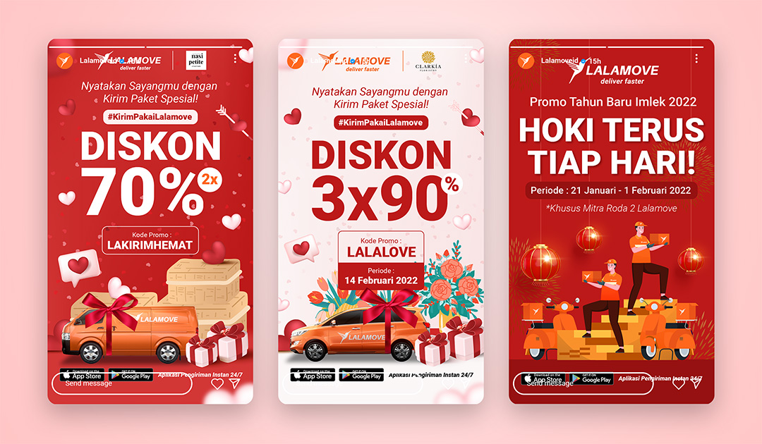 Lalamove is a startup established in Hong Kong, specializing in logistics and delivery services. These social media and digital collaterals, including web and in-app banners, were created to support various marketing campaigns of Lalamove Indonesia. The primary color palette centers around Lalamove’s signature orange, complemented by purple to maintain brand consistency. For special occasions, additional colors were introduced to align with campaign themes, such as pink and red for Valentine’s Day promotions and red for Chinese New Year. The designs were kept dynamic and lively to capture attention and engage the target audience.
