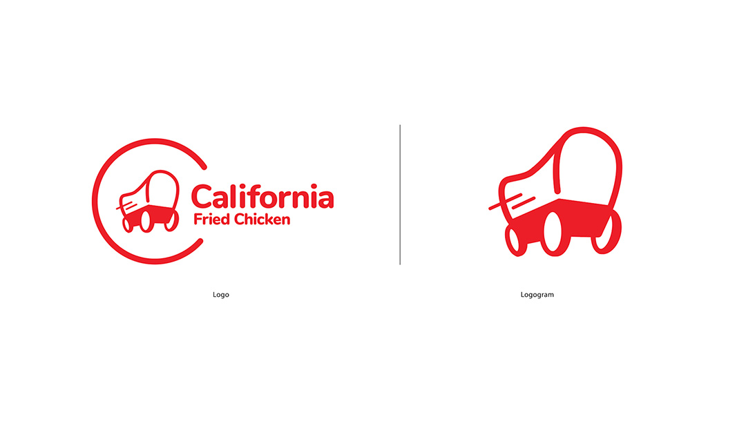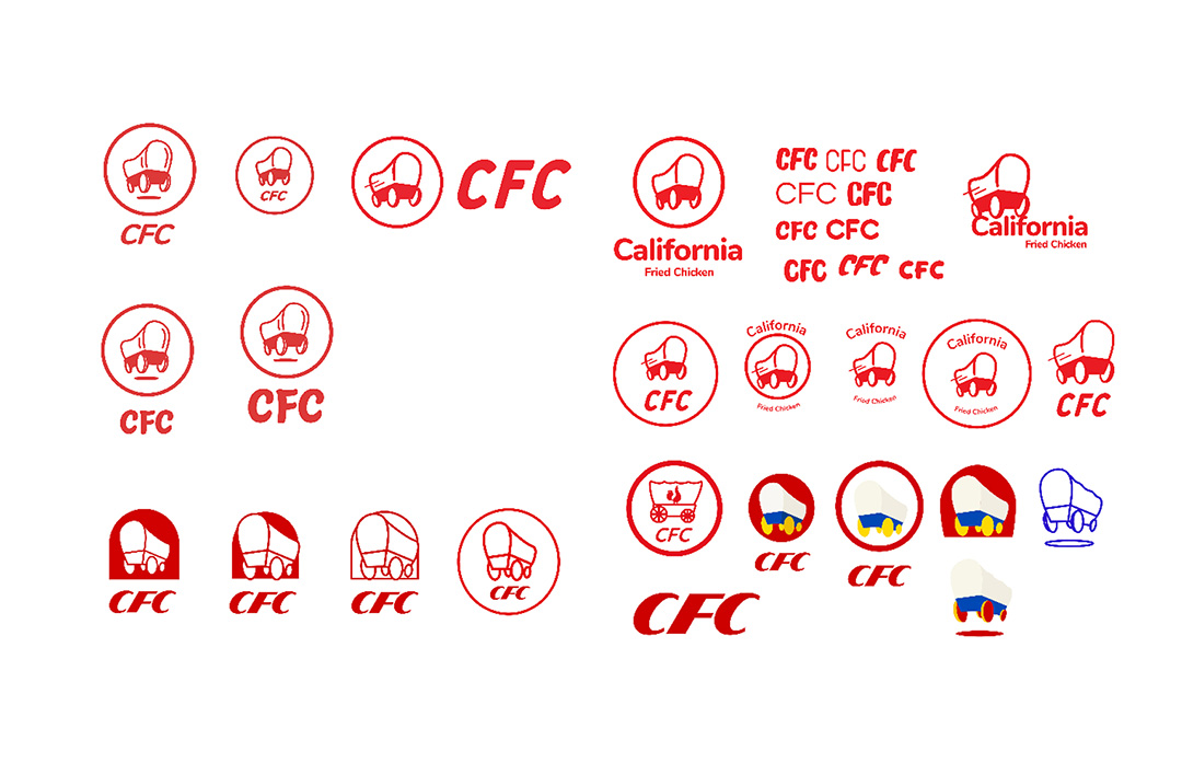 I digitized the sketches and explored variations in color, composition, and typography. While I initially tested yellow and additional graphic elements, these options added unnecessary complexity and raised scalability concerns. I ultimately focused on the wagon and the full brand name, “California Fried Chicken,” to clearly differentiate the brand from competitor KFC.