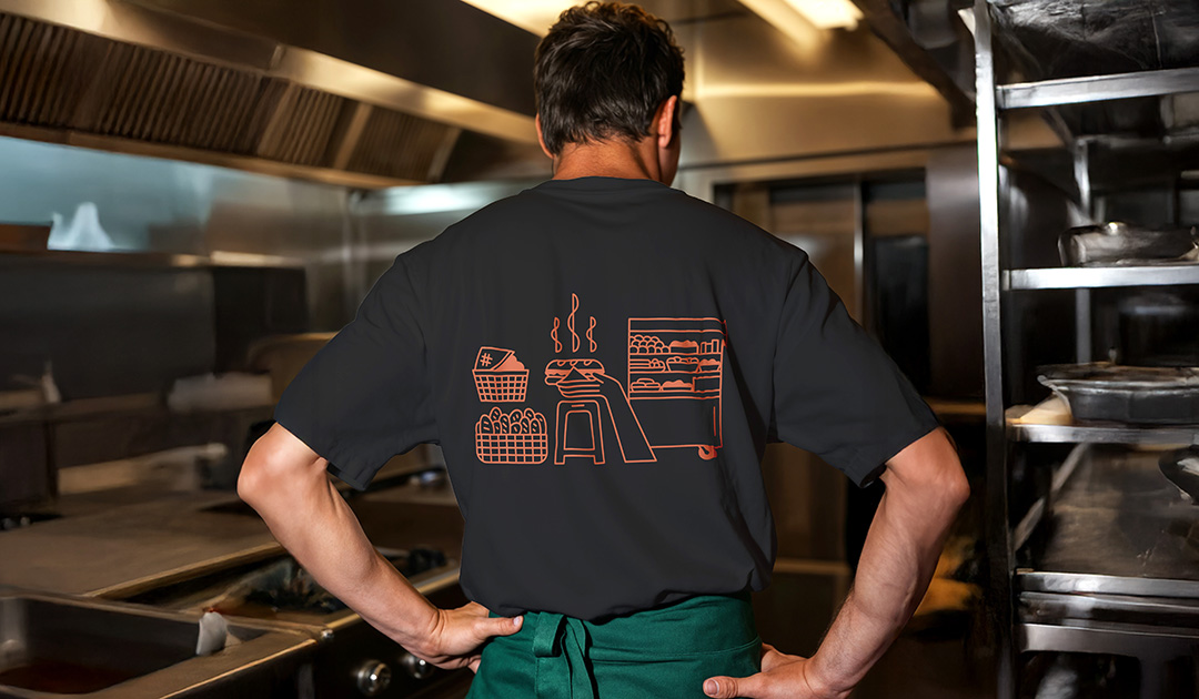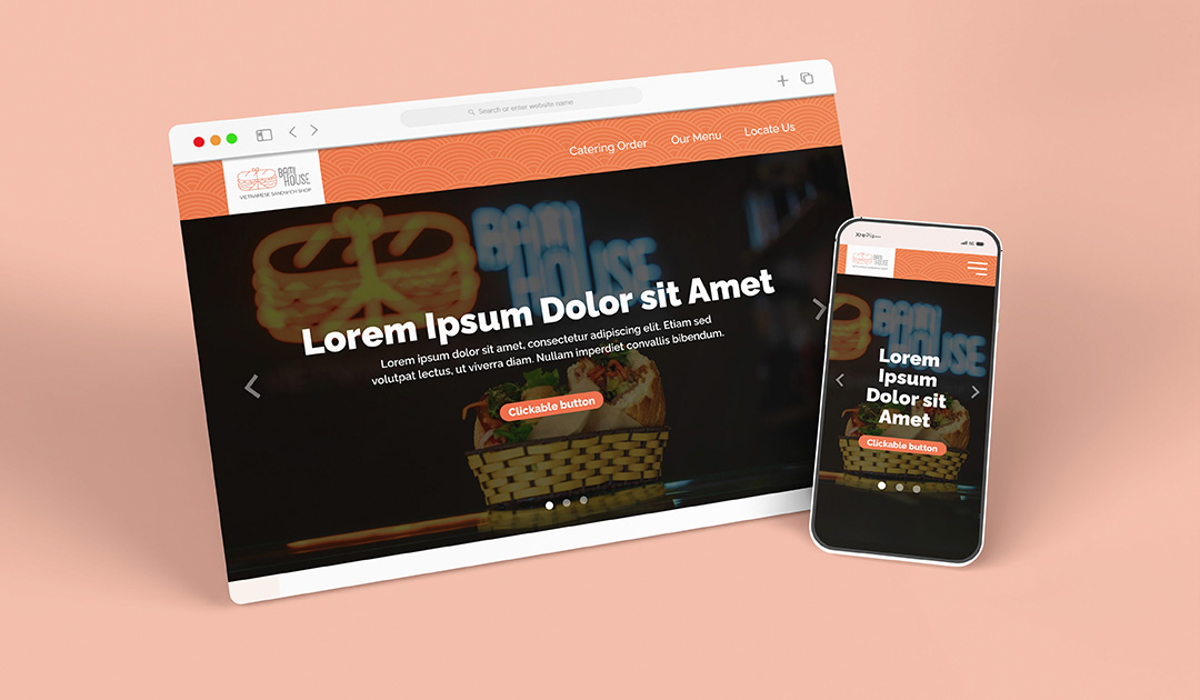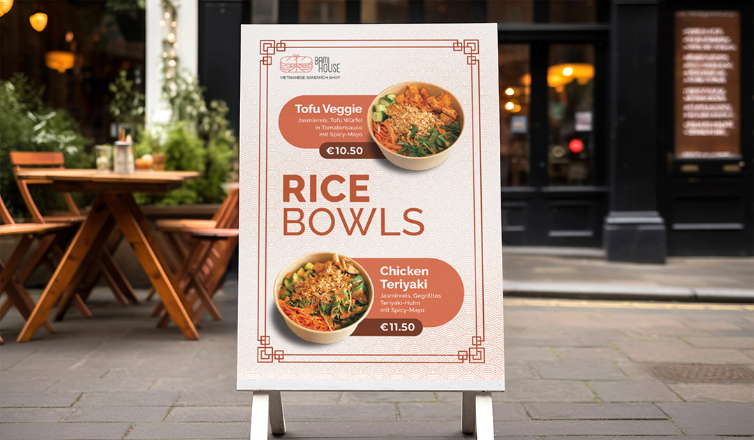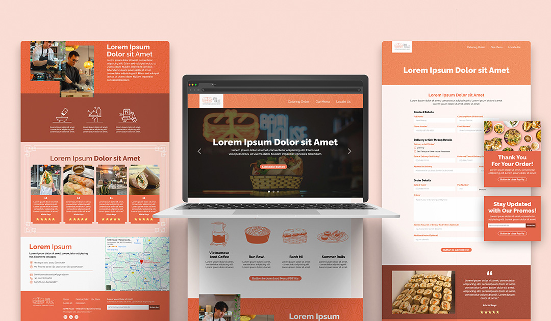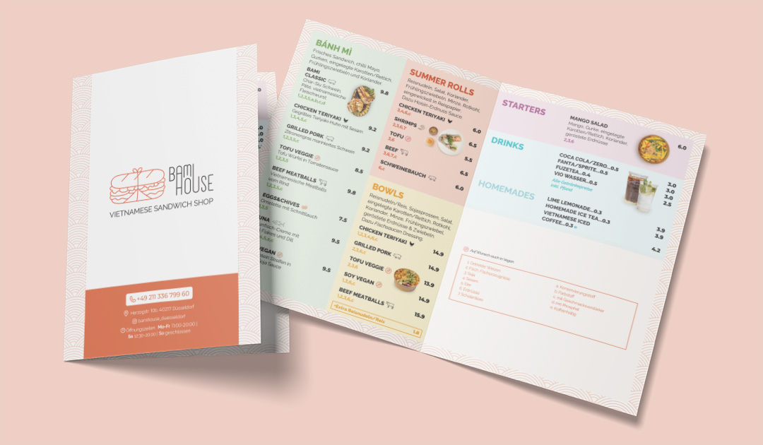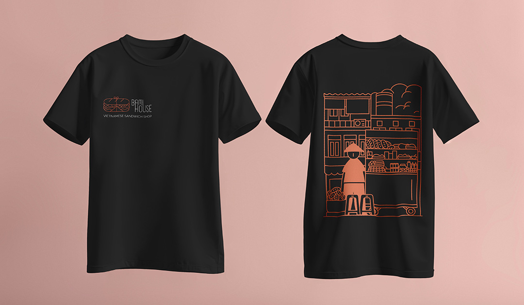 Bami House is a Vietnamese food stall specializing in bánh mì, located in Düsseldorf, Germany. The logo features a classically wrapped bánh mì illustration combined with clean typography and a warm color accent to reflect Vietnamese street food heritage within a modern, urban food stall setting. The overall brand visual and identity incorporates layered patterns in warm terracotta tones, creating an inviting and approachable branding. The staff T-shirts feature illustrated scenes inspired by the traditional Vietnamese bánh mì stalls, reinforcing the brand’s cultural roots. Additional brand collaterals created for this brand included menus, flyers, and a website design.