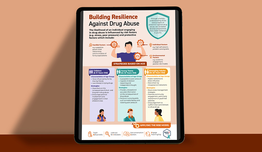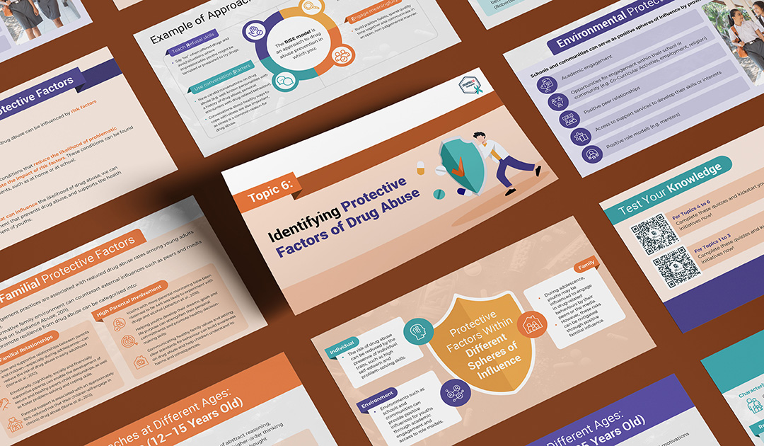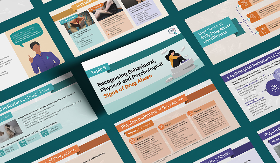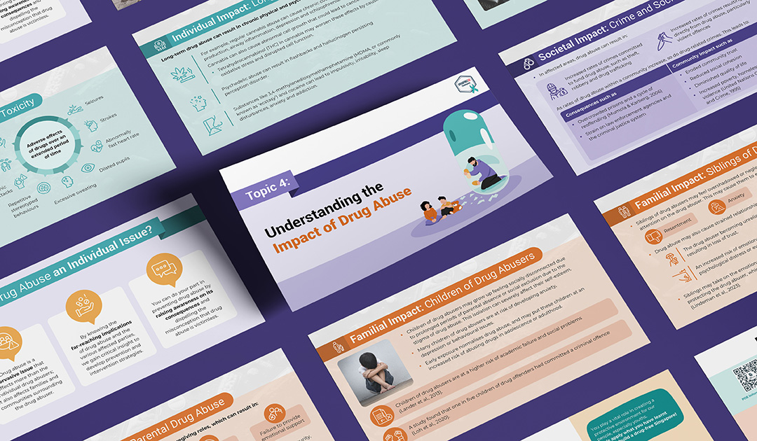 Central Narcotics Bureau (CNB) Singapore is a government agency dedicated to combating drug trafficking and distribution. To address the challenge of low public awareness and understanding of drug abuse indicators, prevention, and impacts, these collaterals were created to educate the public on those topics. Each of these 3 topics was developed into two formats: a set of presentation slides for in-depth explanation, and an infographic for summarised versions. Both formats within the same topic shared a consistent main colour palette to maintain visual cohesion. Additionally, an EDM was designed to announce the launch of these materials to the public.