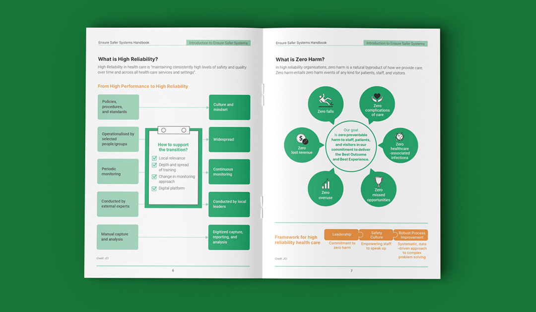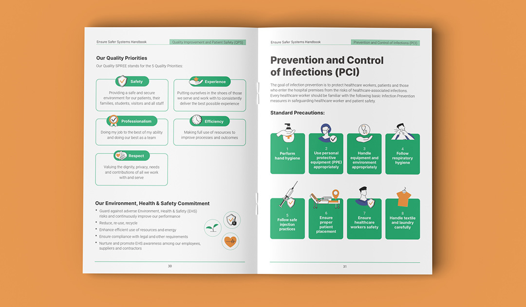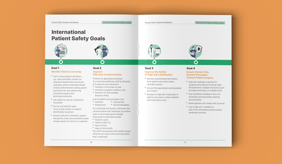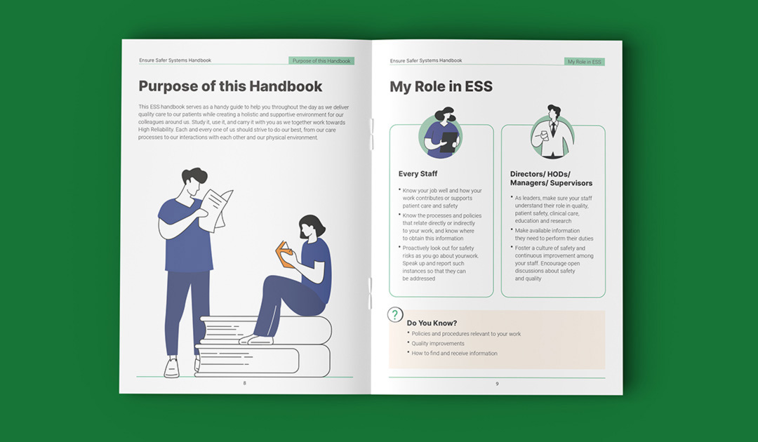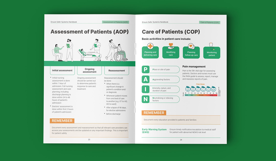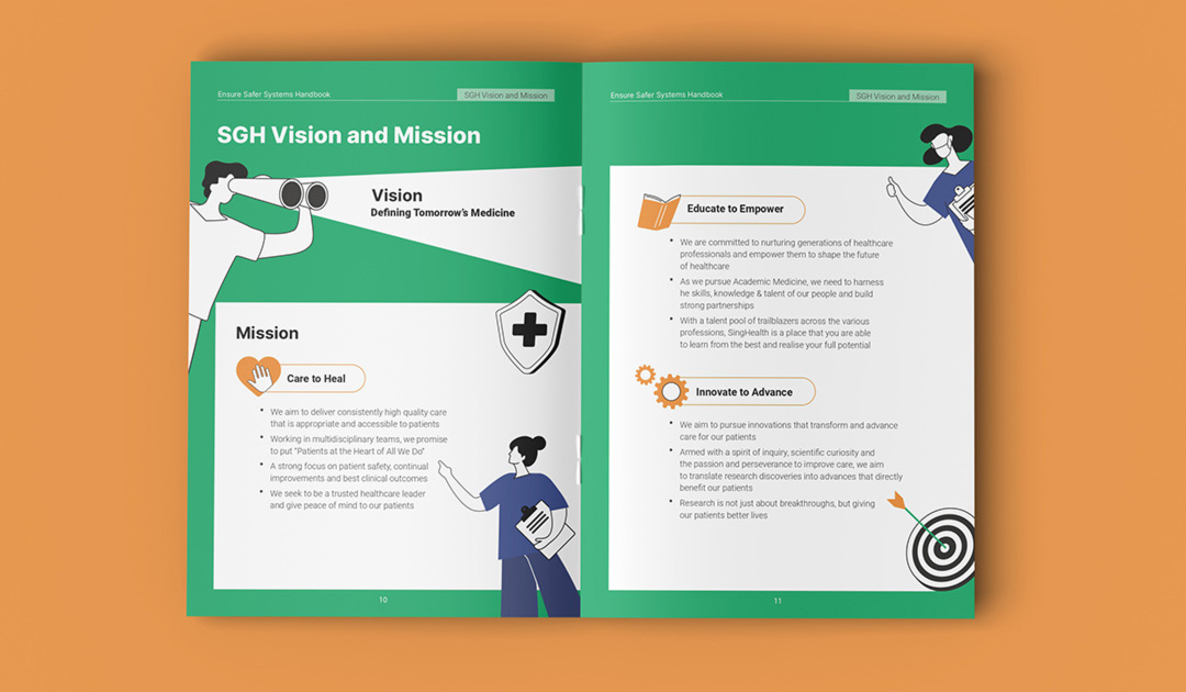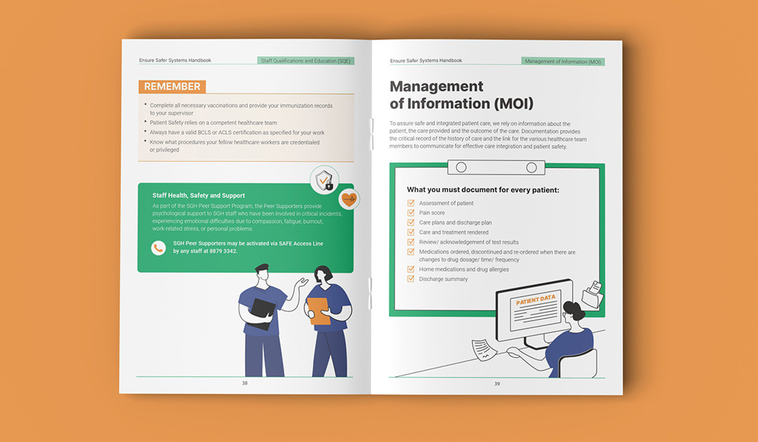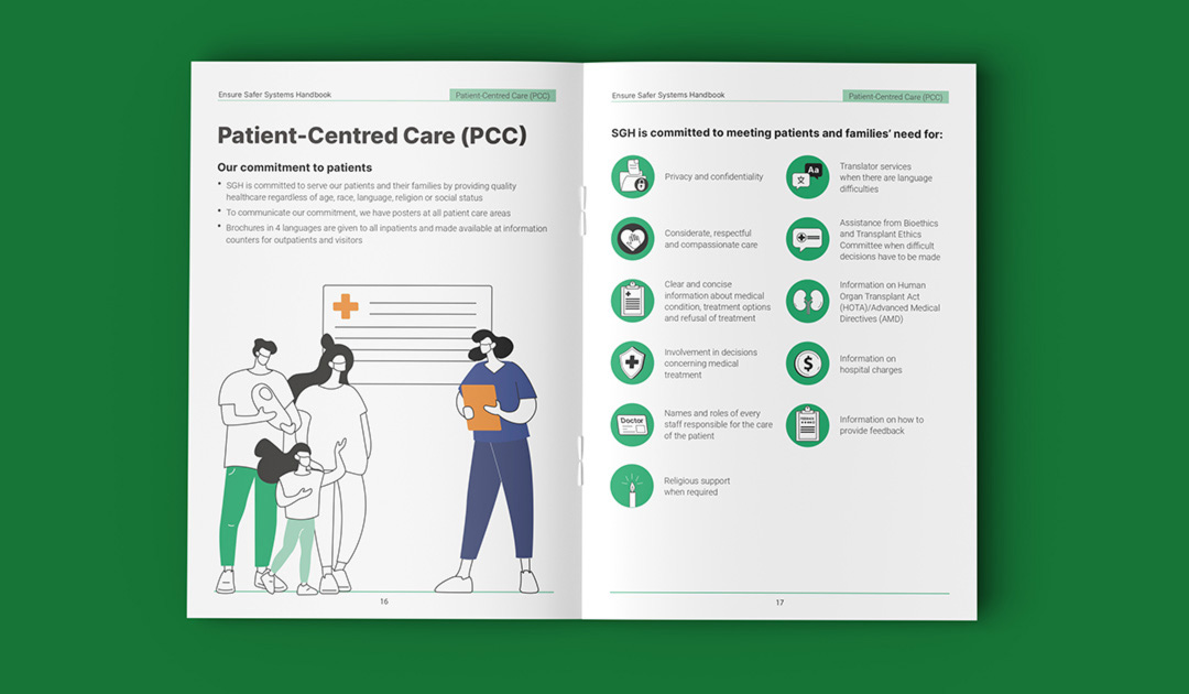 Singapore General Hospital is Singapore’s largest acute tertiary hospital, delivering comprehensive patient-centred care across 50+ specialties while advancing medical education and research. This booklet was designed as an internal guide for SGH’s nurses and medical team to support a high-quality patient care delivery. The cover features flowing line illustrations inspired by medical practices within the hospital. The technical content and copywritings were transformed into clear, intuitive, and structured infographics using icons, illustrations, and succint point forms for easier comprehension. The visual system maintains SGH’s iconic green as the dominant colour to ensure strong brand alignment.