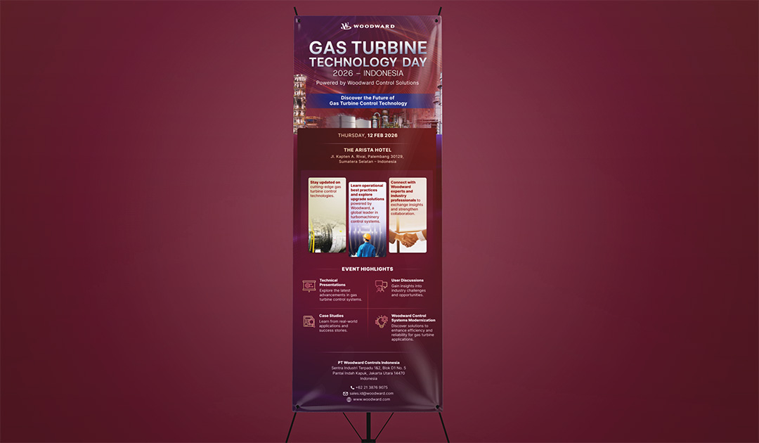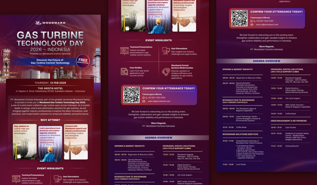 Woodward is a global company designing and supporting energy control and conversion systems for aircraft and industrial equipment. This project was created for Woodward Indonesia’s Gas Turbine Technology Day, an event featuring sharing sessions and discussions on the latest advancements in gas turbine technology. The visual direction was established as technological and sophisticated, incorporating photos of sectors that utilise gas turbines, layered on a subtle background image of a turbine. Flowing line elements were introduced throughout the design to symbolise airflow within a gas turbine mechanism. The colour palette draws from Woodward’s signature red, complemented by cooler tones to create contrast and enhance the technical atmosphere. The design collaterals included an EDM, notebook merchandise, and a Banner.