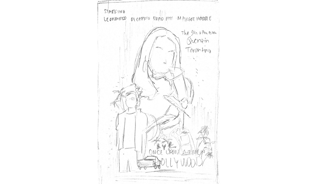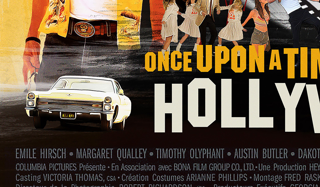 The design is inspired by the sun-drenched Hollywood settings of the film. It uses a warm, vintage colour palette and visual effects that resembles the golden hues of 1960s Los Angeles. Sharon Tate's character is placed centre in the composition as an anchor, while the other characters are surrounds her to reflect the intersecting narratives and creating different depths and movements. The tone and composition combined capture the glamour and grit of the era, immersing the audience in the film’s atmosphere.