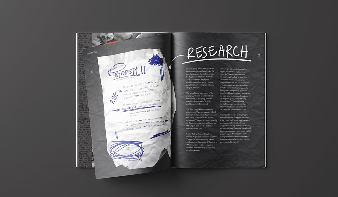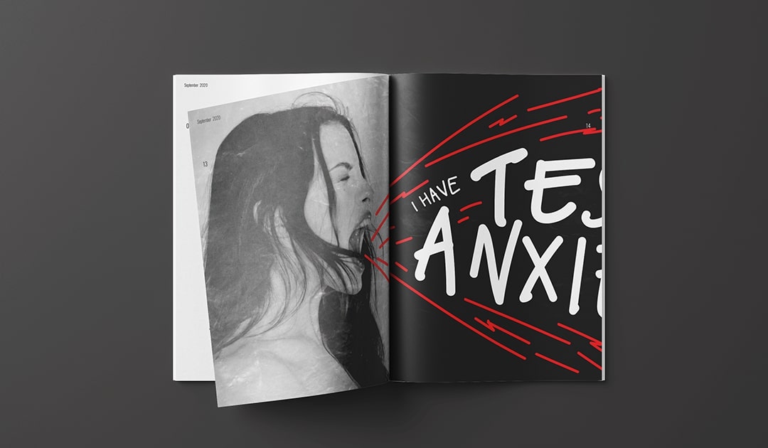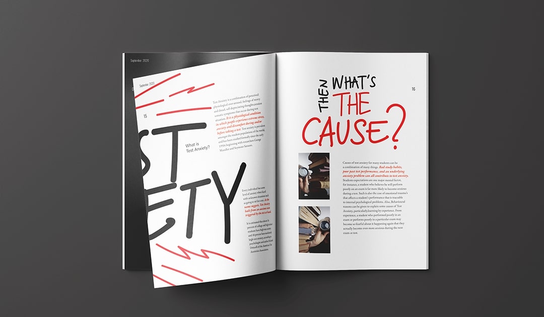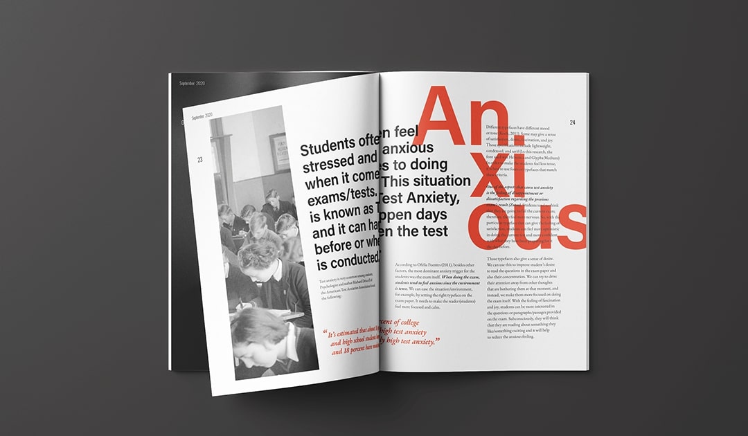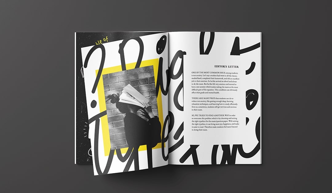 Feeling stressed and worried before or during exams, or known as test anxiety, is a common and recurring challenge among students. This magazine explores how typography choices and considerations in exam papers and questions can help reduce cognitive load and ease test anxiety. Paper textures as background elements with a mix of handwritten and digital typefaces are used to depict “test” and “school” environments. Conventional materials such as paper, pen, and marker are also added to present handwritten research notes, resembling the authenticity of exam settings.